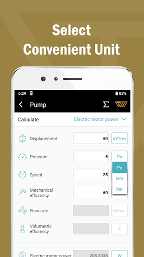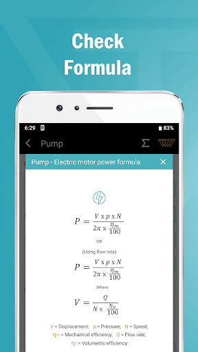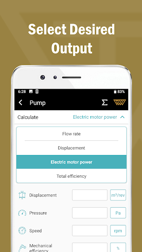 - The app enables the calculation of displacement, flow rate, electric motor power and total efficiency in Pump section
