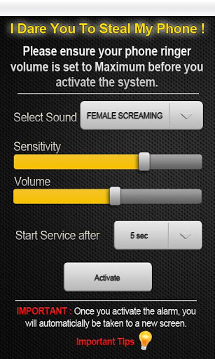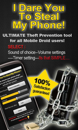 I Dare you to Steal My Phone The Ultimate AntTheft device for your phone. FreeI was at the supermarket about 3 months ago, and I went down to tie my shoe for a period of about 8 seconds.When I looked up to grab my phone from the counter I placed it on, it vanished.They say a devicecar..etc is stolen every 2 seconds in the USA alone.I decided I do not want to be a statistic, but rather a solution to this problem.With this, I bring you the ultimate in phone security The only Phone security tool you will ever need for your Android phone.I DARE YOU TO STEAL MY PHONE Phone lock security system.Best of all its FREESimple place the setting on this very easy user interactive console, and you are all set.We made this as easy as easy to use as possible.My 4 year old was able to use this tool, so I know its easy.Features include:SELECT SOUNDability to choose between 20 different phone notification sounds to alert you WHEN DANGER MIGHT APPROACHSENSITIVITYability to choose between how sensitive you want the notification alert to be on.VOLUMEability to choose at what volume level you want the notification of alert to be heard.Depending on whether you are at a library, or dog track, these settings might verySTART SERVICE AFTERability to choose when you want the phone lock system to be activefrom 545 secondsIMPORTANT TIPSability for the user to review any additional questions they might have when using this highly requested tool.If you have any questions, or if there are any features that might not work on your specific phone, please contact us as soon as possible so that we may be able to fix this issue for you as soon as possible.We hope you enjoy the best antitheft phone protection system on google Play.I dare you To Steal My Phone is the only anti theft system you will ever need.EnjoyI would say good luck, but you wont need it with this