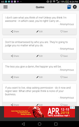 This is an App that stores many great quotes about being yourself and don't care what other think. I will continue adding new quotes timely. There are many I Don't Care Quotes that you can learn from.