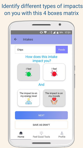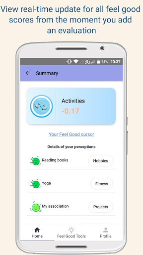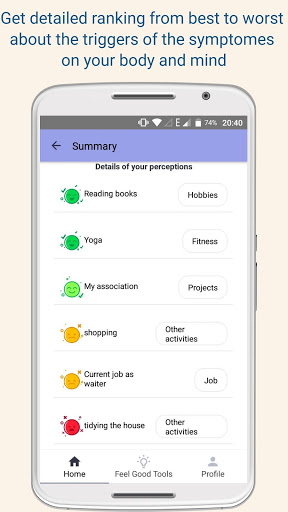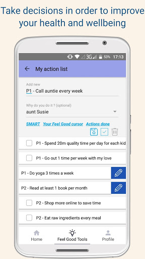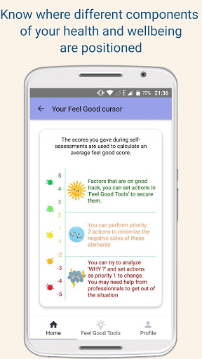 Whenever you feel like something can be done to improve your life but you don’t know where to start, simply open the app and look at the factors' feel good levels. Depending on the factors' impacts on your body and mind you will know what to do in your action plan (also available in the app).