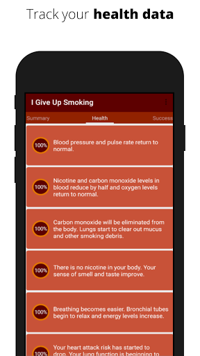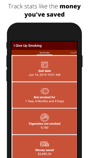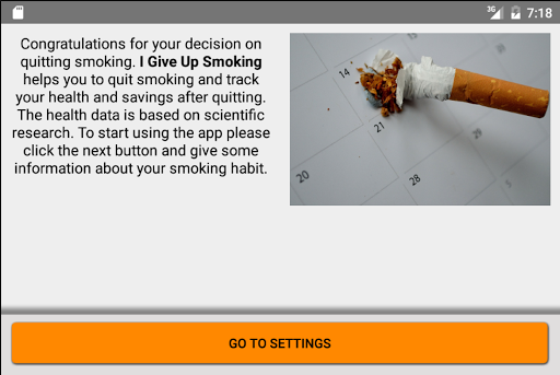 Congratulations for your decision on give up smoking. I Give Up Smoking helps you to quit smoking and track your health and money after quitting. The health data is based on scientific research. To start using the app please click the next button and give some information about your smoking habit.
