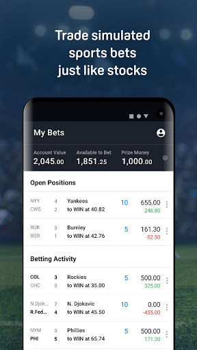 Buy or Sell simulated bets on real sporting events to win $100 at prices the market sets. We don’t set odds and there are no bookmakers. Just you against the market. You can continue to buy or sell until the game is over. Or hold onto your bet till the end. Can you reach an account balance of $2,000?