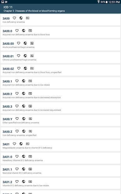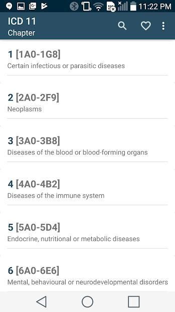 This app contains the entire International Classification of diseases ICD 11 in one place organized by chapters, including a search by description or disease code.