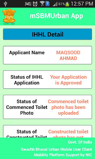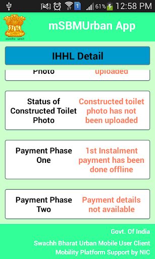 Display IHHL(INDIVIDUAL HOUSEHOLD LATRINE) Application Status.Status of IHHL application would be displayed along with applicant name,status of commence and constructed toilet photo and payment phase level.