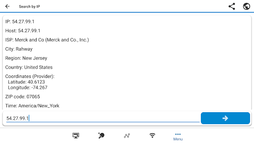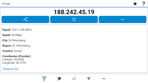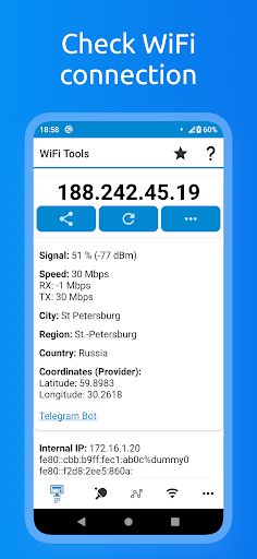 WiFi Tools has a simple interface, so you can receive within seconds full information about your network, find out local, internal or external ip address, SSID, BSSID, dns, ping time, internet speed, signal, broadcast address, gateway, mask, country, region, city, isp provider’s geographical coordinates (latitude and longitude), whois, netstat and other basic information.