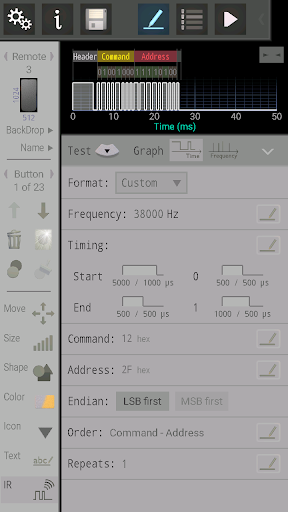 • Generate IR patterns from existing protocols, your own custom one, or from raw timing data.