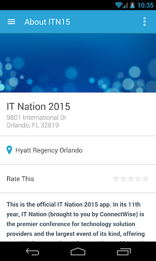 This is the official IT Nation 2015 app. In its 11th year, IT Nation (brought to you by ConnectWise) is the premier conference for technology solution providers and the largest event of its kind, offering a world-class experience for attendees. This app is your key to the 100 breakout sessions, riveting keynotes, world-class Solutions Pavilion with over 75 vendors, legendary networking events and more! Download the IT Nation app for access to all of the breakout descriptions and speakers, event surveys, venue maps and to stay connected with social media during #ITN15.