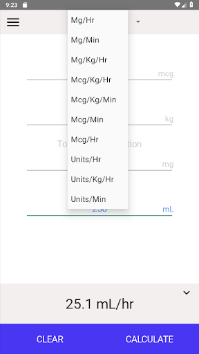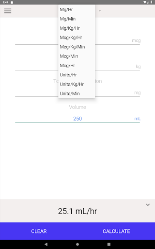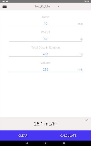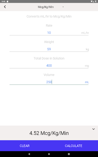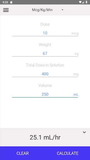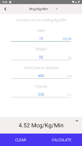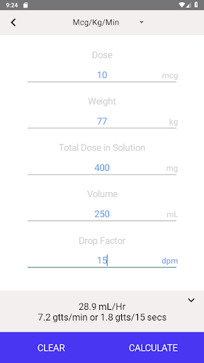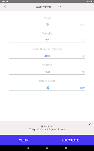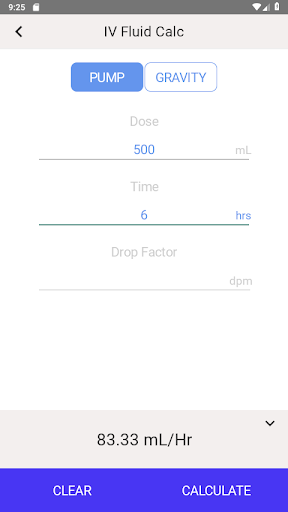 Finally! A simple, straightforward, and useful IV infusion calculator for Android! This calculator works great whether you are using a pump or gravity. It will give you the answer in mL/hr, gtts/min, and gtts/15seconds. You can also plug in the mL/hr to get the infusing dose.