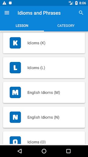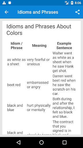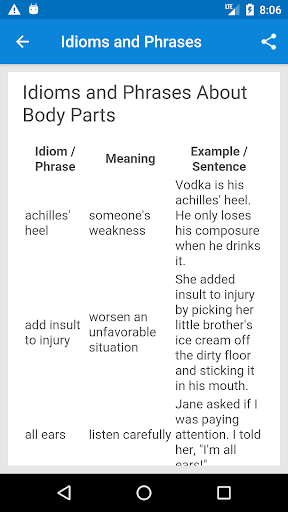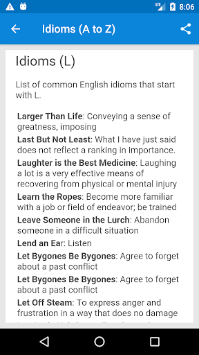 In this App you will find Thousands of free English idioms, idiomatic expressions and Phrases in alphabetical order with their meaning and an example.