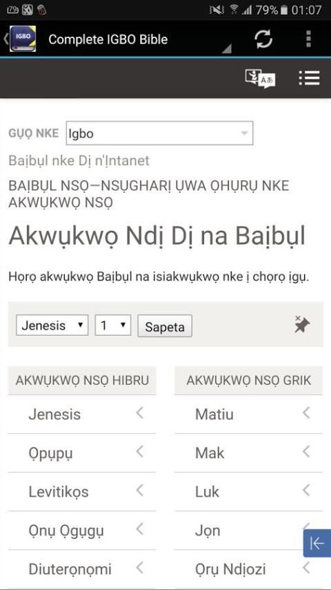 This app give you complete Igbo Bible Nso also known as IGBOB. Also you can read The New Testament of the Holy Bible in PDF format. English version of the bible is available along with Yoruba Bibeli and Littafi Mai Tsarki.