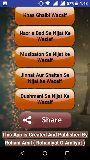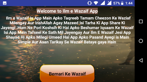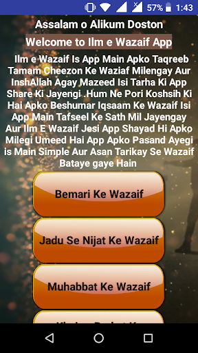 Ilm e Wazaif Is App Main Apko Taqreeb Tamam Cheezon Ke Waziaf Milengay Aur InshAllah Agay Mazeed Isi Tarha Ki App Share Ki Jayengi .Hum Ne Pori Koshsih Ki Hai Apko Beshumar Iqsaam Ke Wazaif Isi App Main Tafseel Ke Sath Mil Jayengay Aur Ilm E Wazaif Jesi App Shayad Hi Apko Milegi Umeed Hai App Apko Pasand Ayegi is Main Simple Aur Asan Tarikay Se Wazaif Bataye gaye Hain