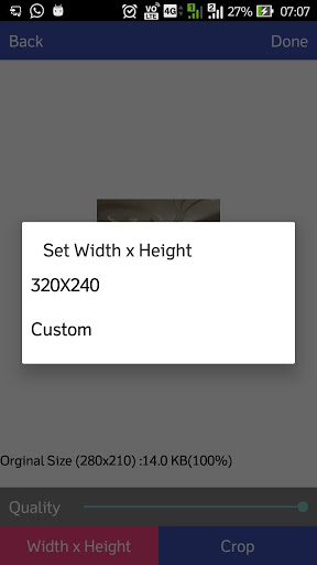 Size compress - In this option , user defines quality of image.Application will compress image according to quality. For good compression user should enter 75% quality.