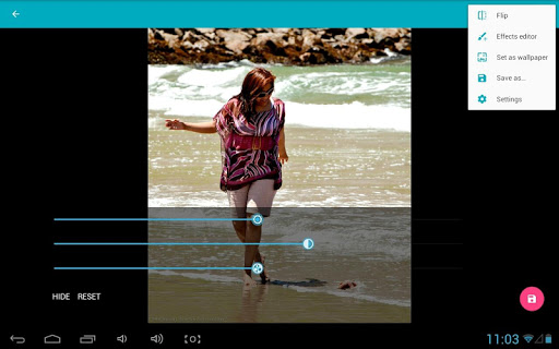 Adjusting brightness, contrast and saturation. View your gallery, set as wallpaper, flip and share with your friends!