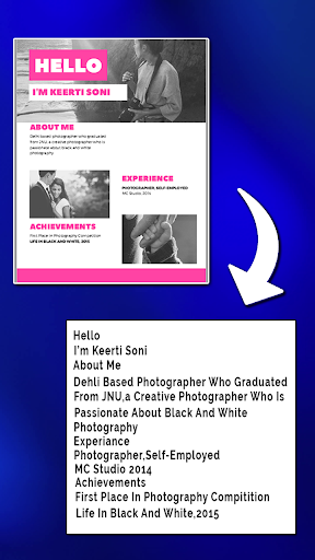 'Image to text converter - Text Scan' is a best image translator and image to text converter. This is a best FREE text scanner & converter application that scan your text that can later can be send via email or share on social media or you can copy that text in clipboard and later can be used in any other app. This app is suitable for everyone, such as students, businessmen, journalists, etc.
