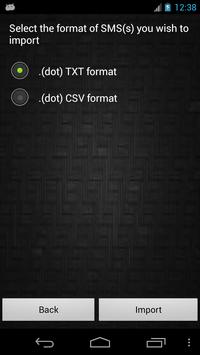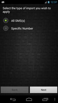 This application helps you to import SMS(s) stored in your phone to SD-card. Just follow 4 easy steps where you can apply filter to retrieve SMS(s) of your choice. After import is done, sms will get copied to SD-card in selected format that is either dot txt or dot csv.
