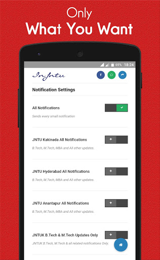With our latest update you can control notifications for JNTUK BTech, MTech, BPham, MPham, MBA and MCA separately and you can also select university like JNTUK, JNTUH, JNTUA.