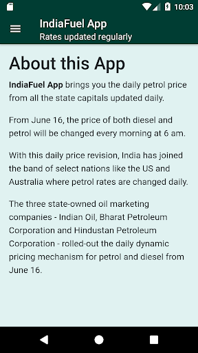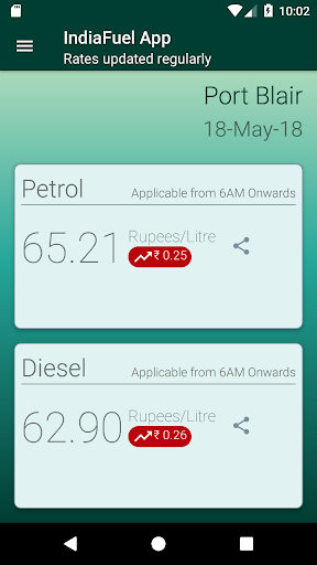 India Fuel Petrol Diesel price daily updated. All india diesel and petrol rate app daily updated all capital cities of india, fuel price, petrol rate, diesel rate, fuel rate, fuel log app which brings you the daily petrol price across all capital cities, updated daily.