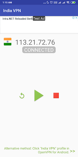 3. Click on "Play" button , the IP address of OpenVPN profile will be save, import and start to connect to the server by pass command to "OpenVPN For Android" app.