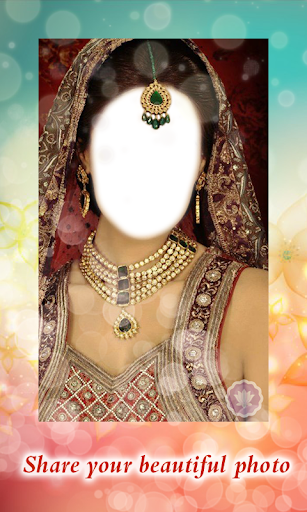Choose your favourite accessories from our wide bridal selection of photo templates in Indian Bride Jewellery Montage. Place face hole in snap a photo. Instant makeover and transform yourself. You can select beautiful Indian wedding headpiece, necklace, forehead and nose rings in this bridal photo editor that will go well with sari, lehanga and many more.