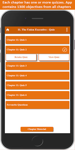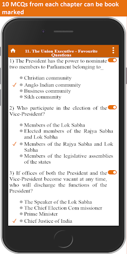 Apps screens are designed such that easy navigation is maintained between study material, quiz, review quiz & view book marked Favourite objective questions on Constitution of India.