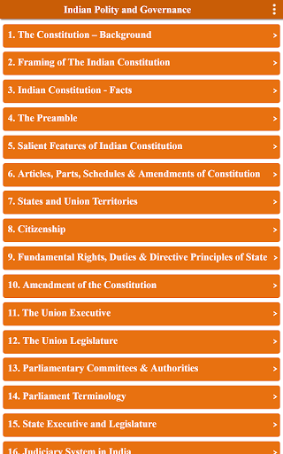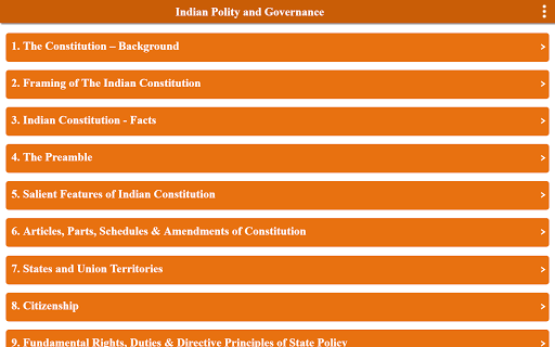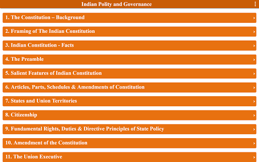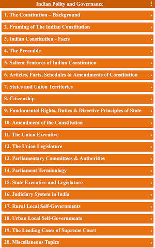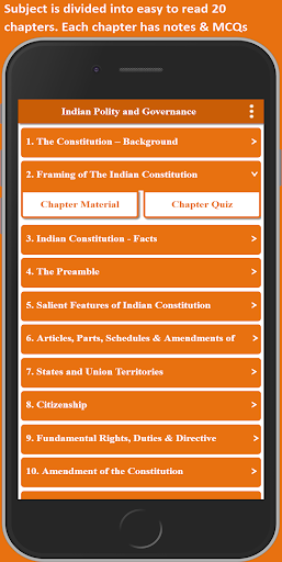 Easy to read, crisp study material that is designed to meet the needs of Government job aspirants. App provides good knowledge and insight to Indian Constitution, Indian Polity & Governance to those who want to understand constitution of India, polity of India without spending much time.
