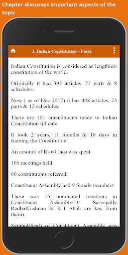 App helps to prepare for civil services examination (IAS, IPS, IFS), Engineering Services Examination (IES) , state services (State Public Service Commission), SSC, SSC CGL (Staff Selection Commission – Combined Graduate Level Exam 2018), Railway Recruitment Board(RRB), Defence, MBA, UGC/NET, Bank P.O, Police, Constable, SI & competitive exam on subject with concise material on Constitution or Polity of India.