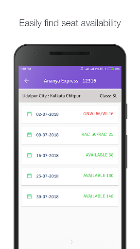 Check seat availability and fares of IRCTC. The app covers Konkan Railway, Central Railway (CR), Northern Railway (NR), Southern Railway (SR), Eastern Railway (ER), Western Railway (WR) and all other Indian railway zones.