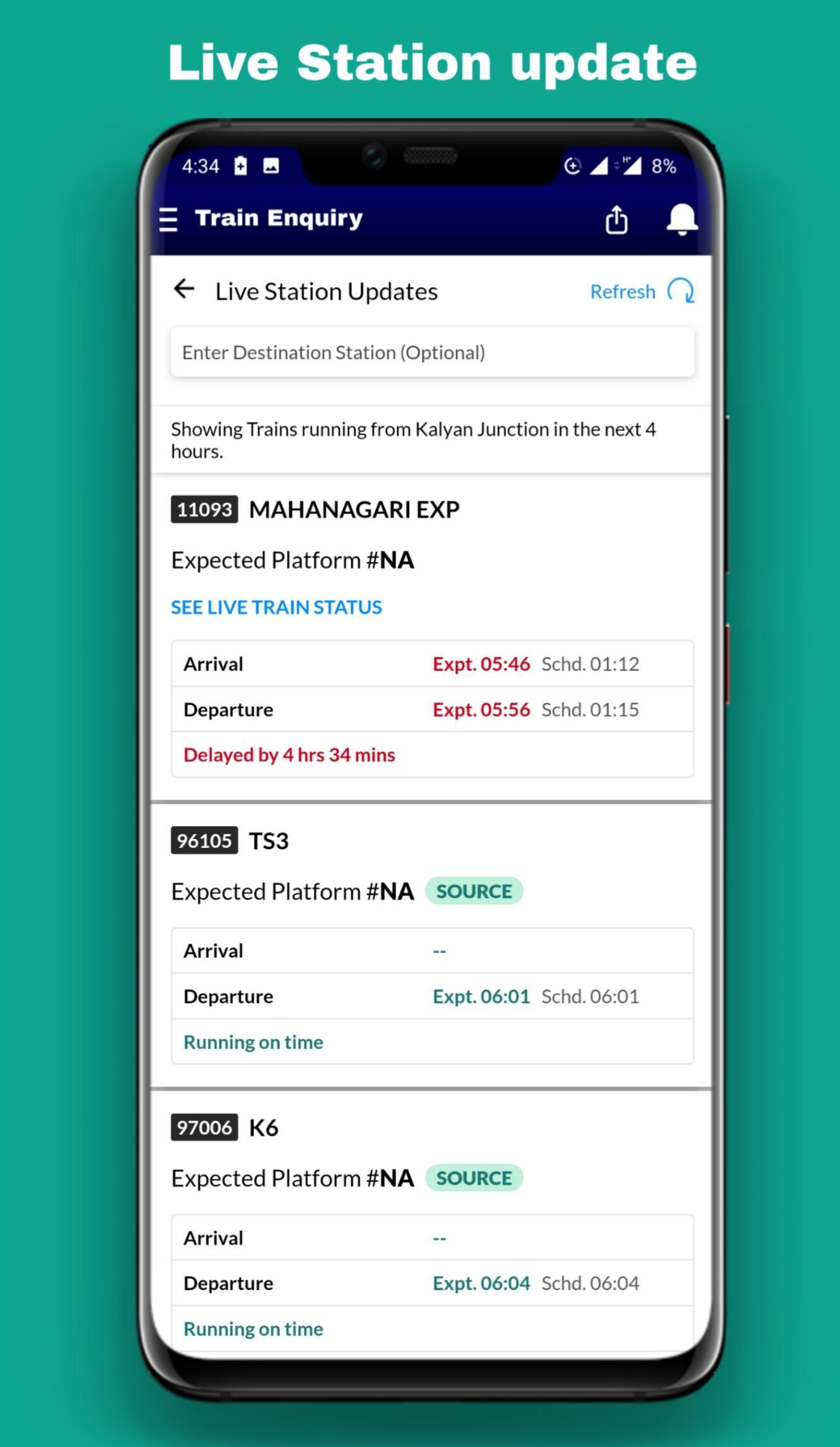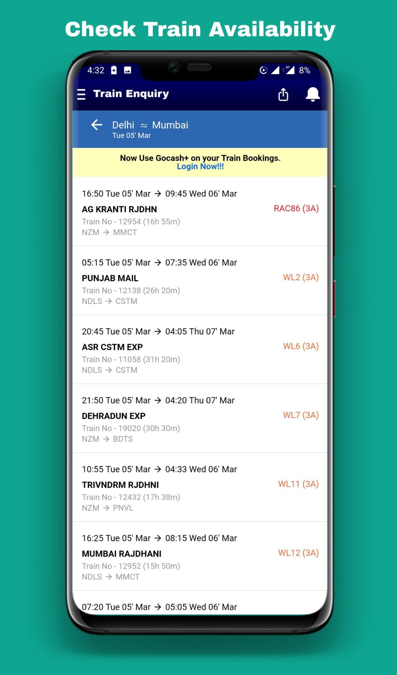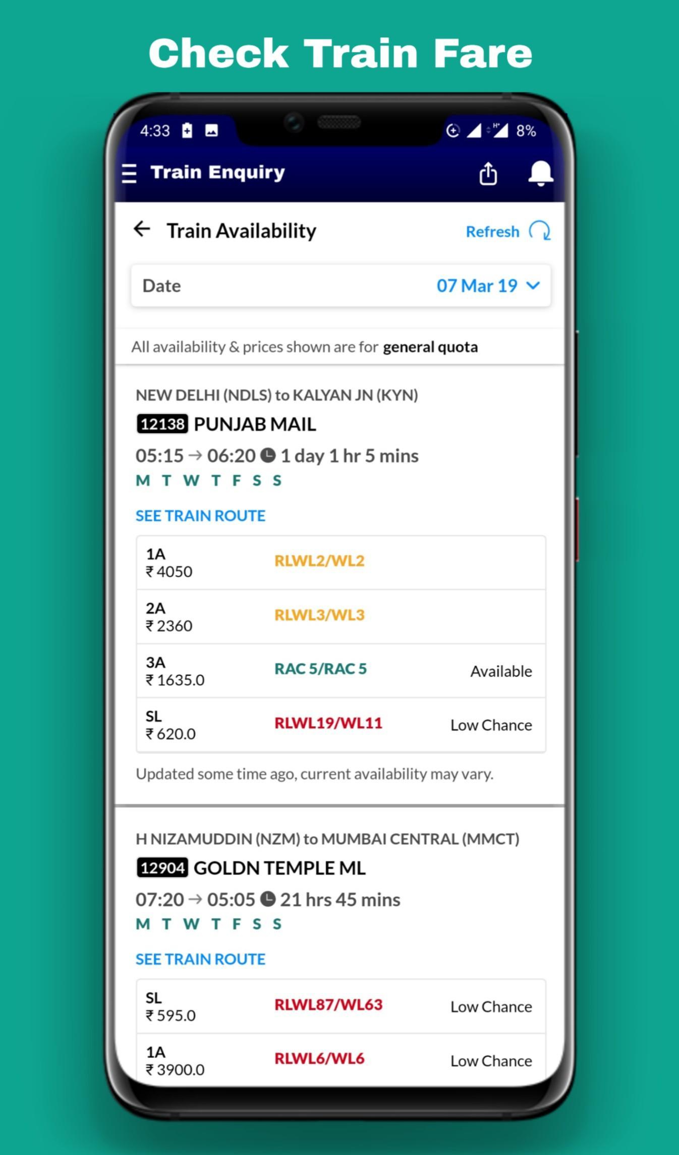 Indian Railway and IRCTC info like NTES live train running status, PNR status, train time table, train running status, train enquiry and all other train information is now at your fingertips with this Indian Railway app! You can use this indian rail app to spot your train, book train tickets, check train seat map, check PNR status, prediction, seat availability, station status, train enquiry, train platform information, fare enquiry, railway station information etc. You can spot where is my train (live train status), set train alarm and get answers to all indian rail enquiries and information on Indian Railways & IRCTC.