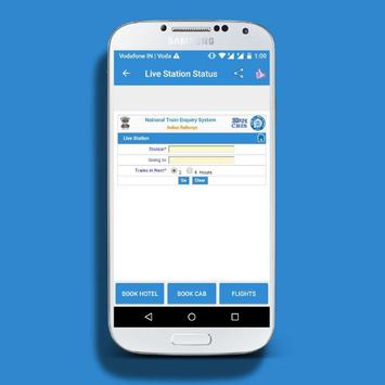 Live Station (Arrivals and Departures): Daily travelers get information on all the trains arriving or departing from a particular station within the next 2/4/6/8 hrs.This app provides this information directly from IRCTC / NTES servers.