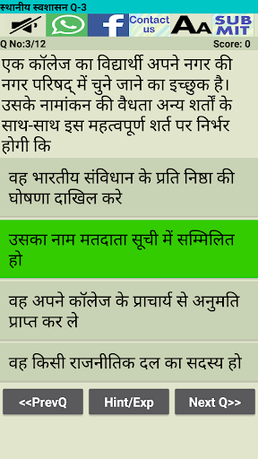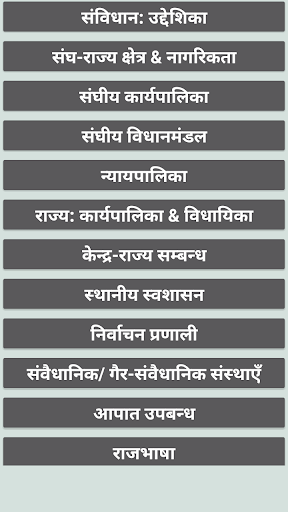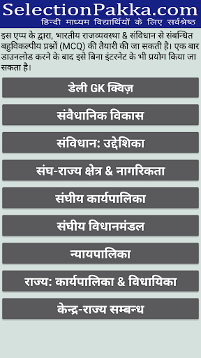 इस एप्प में भारतीय राजव्यवस्था से संबन्धित बहुविकल्पीय प्रश्नों (MCQ) का संकलन दिया गया है। इनमें से बहुत से प्रश्न विभिन्न प्रतियोगी परीक्षाओं (जैसे: UPSC IAS, State PCS, SSC, NDA, CDS, CAPF, Judiciary) में बार-2 पूँछे जा चुके हैं।