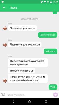 Indra lets users use Indore city bus in a more efficient manner . On entering the source and destination Indra tells the user when the route number of the bus that can move the user and also the estimate time he needs to wait for the bus to arrive at the source . The chat interface makes it extremely easier for information query and retrieval thereby increase use of Indore city bus as a public transport option and lesser private transport .
