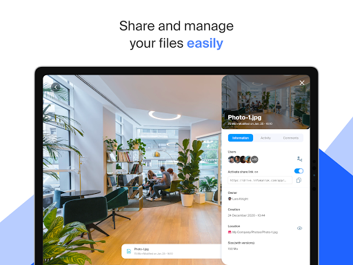 Infomaniak is an independent company owned exclusively by its employees. We don’t analyse or resell your data. You retain full control of your data and can work and collaborate without any limits in a secure ecosystem. The kDrive app is open source and you can consult its code on the Infomaniak github.