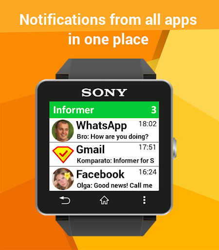Informer brings notifications from different apps to your Sony device: SmartWatch MN2, SmartWatch SW2, headsets SBH50 SBH52.