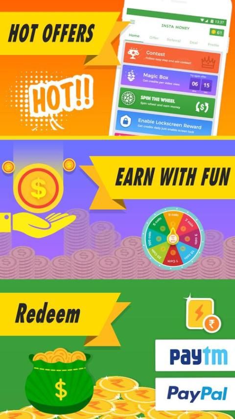 Insta Money is simple app that provide you platform for earn cash using your mobile device. You just need to complete simple tasks like Downloading apps, Watch videos, Refer your friends, Competing Survey, LockScreen reward, Spin wheel, Give review etc.
