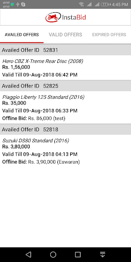 InstaBid-For Bikes enables dealers to capture basic details bikes along with images and provides best offers for the exchange bike. Offers have limited validity and can be seen on the app itself