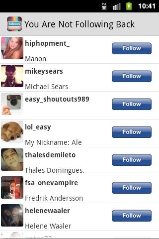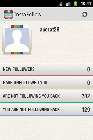 Ever wondered who unfollowed you on Instagram? With InstaFollow, you can find who unfollowed you, who is not following you back, track new followers, and more... features - Track new followers - Track unfollowers (users who followed you and decided to not follow you anymore) - Track users that don't follow you back - Track followers you don’t follow Back - Follow and unfollow users PLEASE READ: - You must have an Instagram account to use this app. - The number of users you follow or followed by must not exceed 20 000 in order to enjoy the full functionality of the app. - You can follow or unfollow up to 160 users per hour (Limited by Instagram).