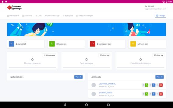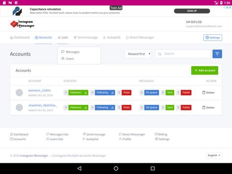 Instagram Messenger is a Multiple Instagram Accounts Messenger system or you can say management tool. You may be searching something, through which you can manage your multiple Instagram accounts messaging. If the answer is "yes " then you will definitely be happy to know that this app can give you complete management system for you multiple Instagram accounts message management. or can act as single account message manager.
