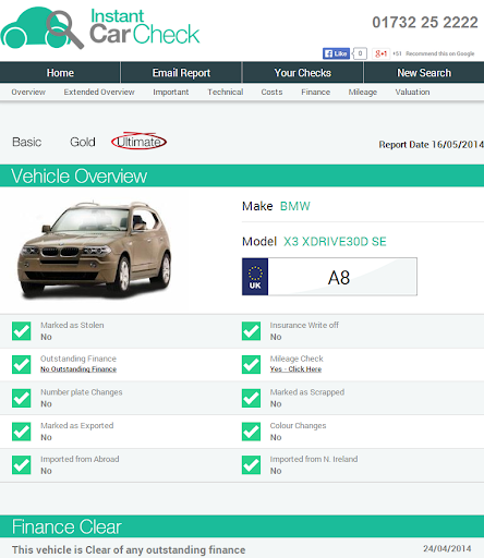ULTIMATE!: Everything from the basic and gold reports plus a full 5 part valuation of the vehicle provided by Glass's. The value when new, dealer value, private price, part-ex value, and poor condition price.