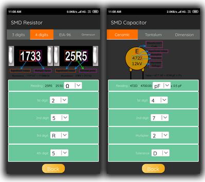 Calculator for decoding of smd resistors sizes 0603, 0805 and 1206, as well as ceramic capacitors.Color marking resistors and inductor.