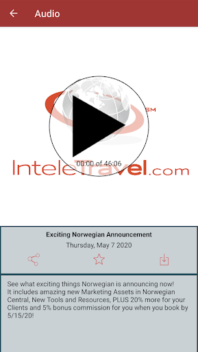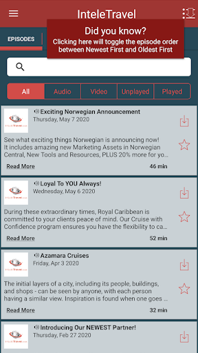 With this app you are always connected to the latest episodes and the show. Quickly star episodes and save them to a list so you can easily enjoy them over and over! This app has a Car mode too! Rotate your phone to display larger playback controls. It is the best and most convenient way to access InteleTravel training.