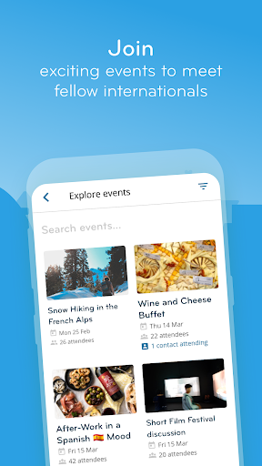 InterNations is the world's largest network for people living and working abroad. As a member of our global community, you can network, socialize, and find expat-relevant information — both online and face-to-face. InterNations has communities in 420 cities around the world, making it easy for you to meet expats and global minds in your city. Our app will help you to find new friends, grow your network, and discover a wide range of events where you can share your experiences with like-minded people.