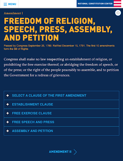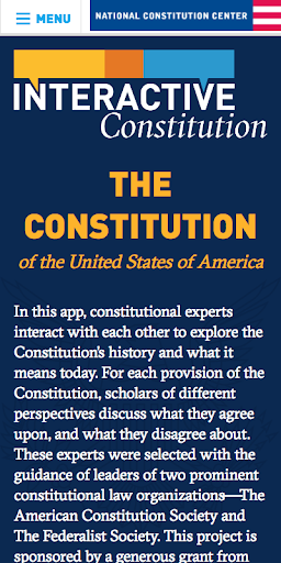 The free Interactive Constitution app presents the full text of the U.S. Constitution and features essays by leading scholars that detail areas of agreement and disagreement across a range of philosophical and legal perspectives. Created by the National Constitution Center in partnership with the American Constitution Society and the Federalist Society, this nonpartisan resource is featured by the College Board in its Advanced Placement history and government courses.