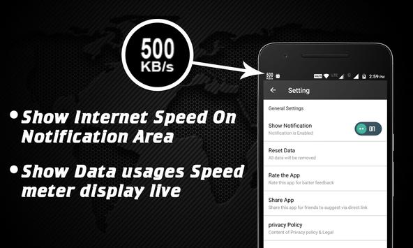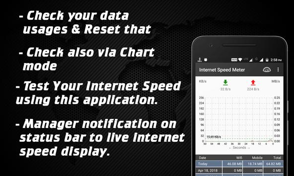 - Internet Speed Meter 2018 shows real time Internet speed of your Internet connections on Status bar and Notification bar.