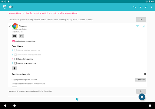 Apps and domains can individually be allowed or denied access to your Wi-Fi and/or mobile data.