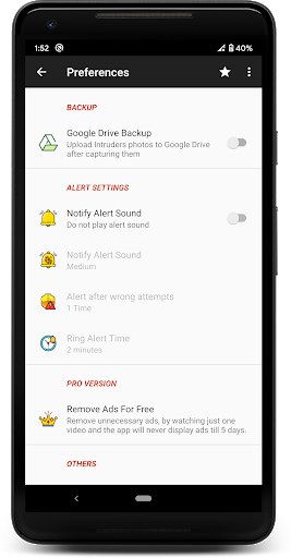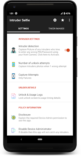 - Alarm and stores captured photos on your Google drive as proof is your device gets stolen