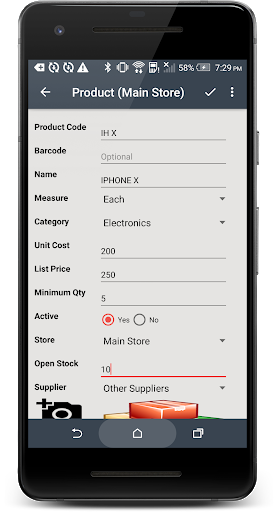 Products: Create product integrated with barcode reader program to use barcode also you can store product image.
