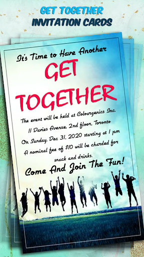 Create beautiful invitation cards for all occasions by choosing a simple free invitation template and edit on your own images and messages (General Cards, Anniversary Cards, Engagement Cards, Wedding Cards, Baby Shower Cards, Birthday Invitation Cards, New Year Invitation Cards, Housewarming Cards, Get Together Invitation Cards with the best party invite maker which allows to invite your friends and family by sending invitation cards (via) e-mail or any other social networking platforms directly from the app.