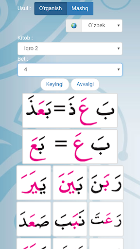 Uzbek: Iqro App dasturi yordamida Qur'on oq'ishni oson usulda o'rganishga yordam beradi. Iqro dasturi bepul bo'libgina qolmay, dasturda hech qanday "reklama" jo'ylashitirlmagan.