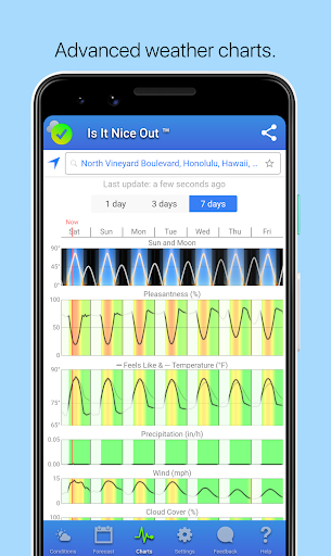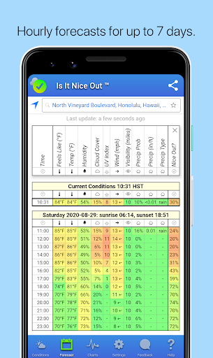 When will the weather be nice? Is It Nice Out provides high accuracy weather forecasts, and summarizes them into a single pleasantness score.