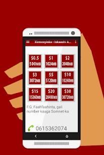 Waxaad ka iibsan kartaan xirmooyinka SomNet. Hada kadib uma baahnid in aad cid la hadashid ama qarash telefan ku bixisid si laguugu shubo xirmo SomNet hadii aad isticmaashaan Iskaashi app. Sidoo kale ka waxaad ka heli doontaa Adeegyada EVC Plus, ANFAC iyo Artimet